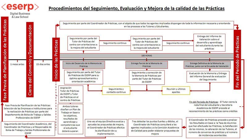 Después de definir, diseñar, ofrecer, promover y gestionar cualquiera de los programas de prácticas externas se asigna al estudiante un profesor tutor para sus prácticas; del mismo modo, le es asignado un profesional tutor perteneciente a la empresa o institución de acogida de las prácticas. El profesor tutor y el profesional tutor diseñan el plan de trabajo de la práctica según los objetivos y las competencias específicas que requieren las necesidades formativas del estudiante; asimismo, ponen a su disposición la documentación necesaria que recoja las orientaciones generales y la información general y específica necesaria para una adecuada superación de las prácticas. Durante el transcurso de la práctica, y según los criterios fijados por el centro, el profesor tutor realiza su seguimiento académico, se asegura de su óptimo aprovechamiento y orienta al estudiante para obtener los mejores resultados posibles (para ello, consigna cualquier aspecto relevante acontecido durante la realización de la práctica en un informe de seguimiento). El profesional tutor de la empresa o institución de prácticas realiza también un seguimiento del estudiante y consigna sus observaciones y valoraciones en un informe. Al término del período de prácticas, se procede a la evaluación del estudiante según lo fijado por el centro y siempre teniendo en cuenta los informes de seguimiento del profesor tutor y el profesional tutor. Del mismo modo, la secretaría del centro procede al reconocimiento de las prácticas como créditos.
